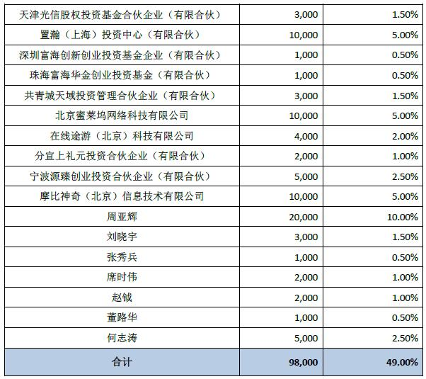 头牌要算360公司(601360)创始人“红衣大炮”周鸿祎。其控制的在线途游(北京)科技有限公司、摩比神奇(北京)信息技术有限公司,分别从辰海科译买了2%和5%闲徕互娱股份,分别出资了4000万元和1亿元。