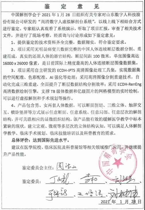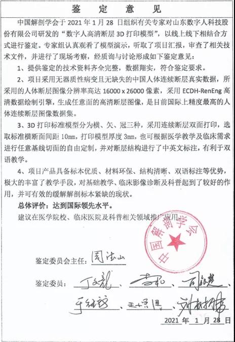 1月28日,中国解剖学会组织有关专家对数字人开发的“高清数字人虚拟解剖台系统”、“数字人高清断层3D打印模型”进行了鉴定,并出具了《鉴定意见》,认定高清数字人虚拟解剖台系统产品“达到国际先进水平”;数字人高清断层3D打印模型产品“达到国际领先水平”。