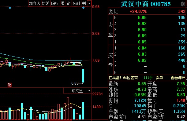 今日,大盘整体走势不佳,深证成指下跌6.07%。武汉中商股票跳空低开后震荡向下,近乎跌停,最终,报收于6.85元/股,大跌9.63%。
