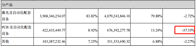 对于业绩同比大幅下降,大族激光给出了几条理由:消费电子行业周期性下滑及中美贸易摩擦导致订单下降,已签约客户推迟提货。拆分开来看,消费电子及PCB业务盈利能力强,但是下滑较大,其中消费电子下降17.67%,PCB设备领域下降37.55%。