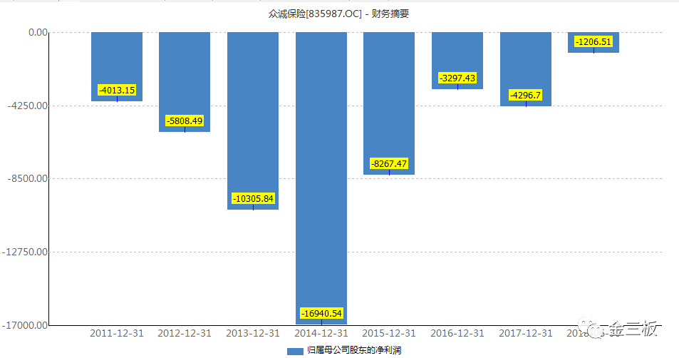 更重要的是,2011年成立至今,众诚保险从未盈利,截至2018年中报,公司累计未分配利润-5.41亿元。就这一项来看,众诚保险在一万多家新三板公司中,高居前十。