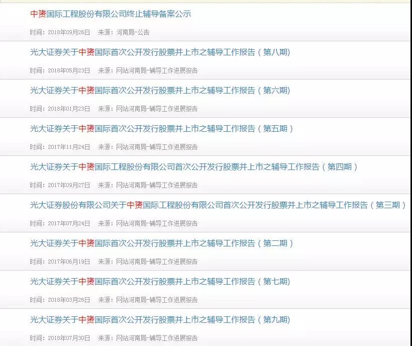 在辅导期间,河南证监局官网先后公布了光大证券对中赟国际的9期辅导工作报告。其中第九期辅导时间为今年5月14日-7月16日。