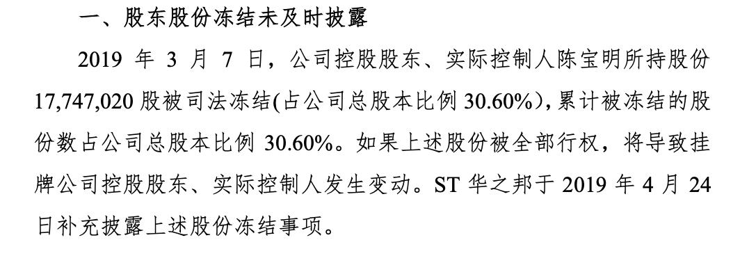 公告显示,2019年3月7日,ST华之邦控股股东、实控人陈宝明所持股份1774.702万股被司法冻结(占公司总股本比例30.60%),如果上述股份被全部行权,将导致挂牌公司控股股东、实际控制人发生变动。ST华之邦于2019年4月24日补充披露上述股份冻结事项。