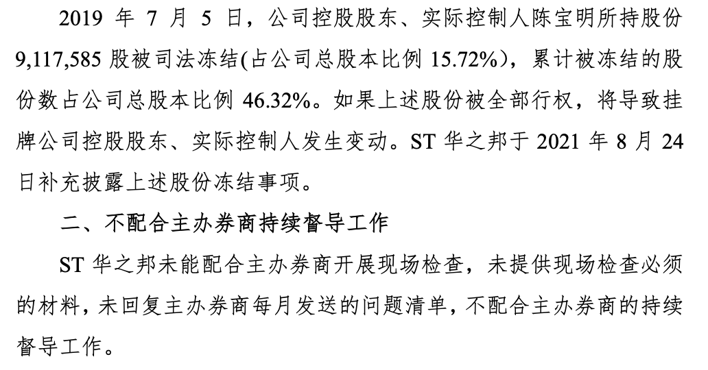 另外,ST华之邦未能配合主办券商开展现场检查,未提供现场检查必须的材料,未回复主办券商每月发送的问题清单,不配合主办券商的持续督导工作。