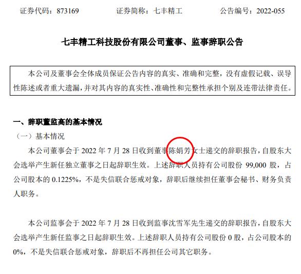 巧合的是,在发布更正公告的同时,七丰精工宣布董秘兼财务负责人陈娟芳因个人原因退出董事会。根据七丰精工修改后的章程显示,公司将新增1名独立董事。