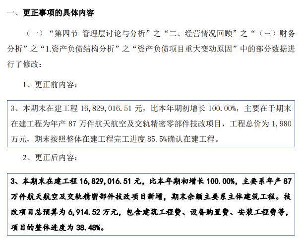 更正后为“本期末在建工程 16,829,016.51 元,比本年期初增长 100.00%,主要系年产87万件航天航空及交轨精密部件技改项目新增,期末余额主要系主体建筑工程。技改项目总预算为 6,914.52 万元,包含建筑工程费、设备购置费、安装工程费等,项目的整体进度为 38.48%。”