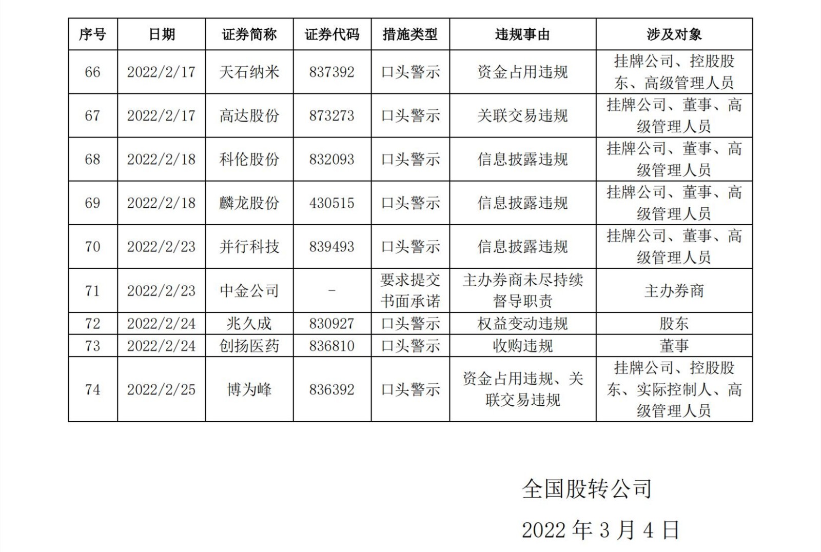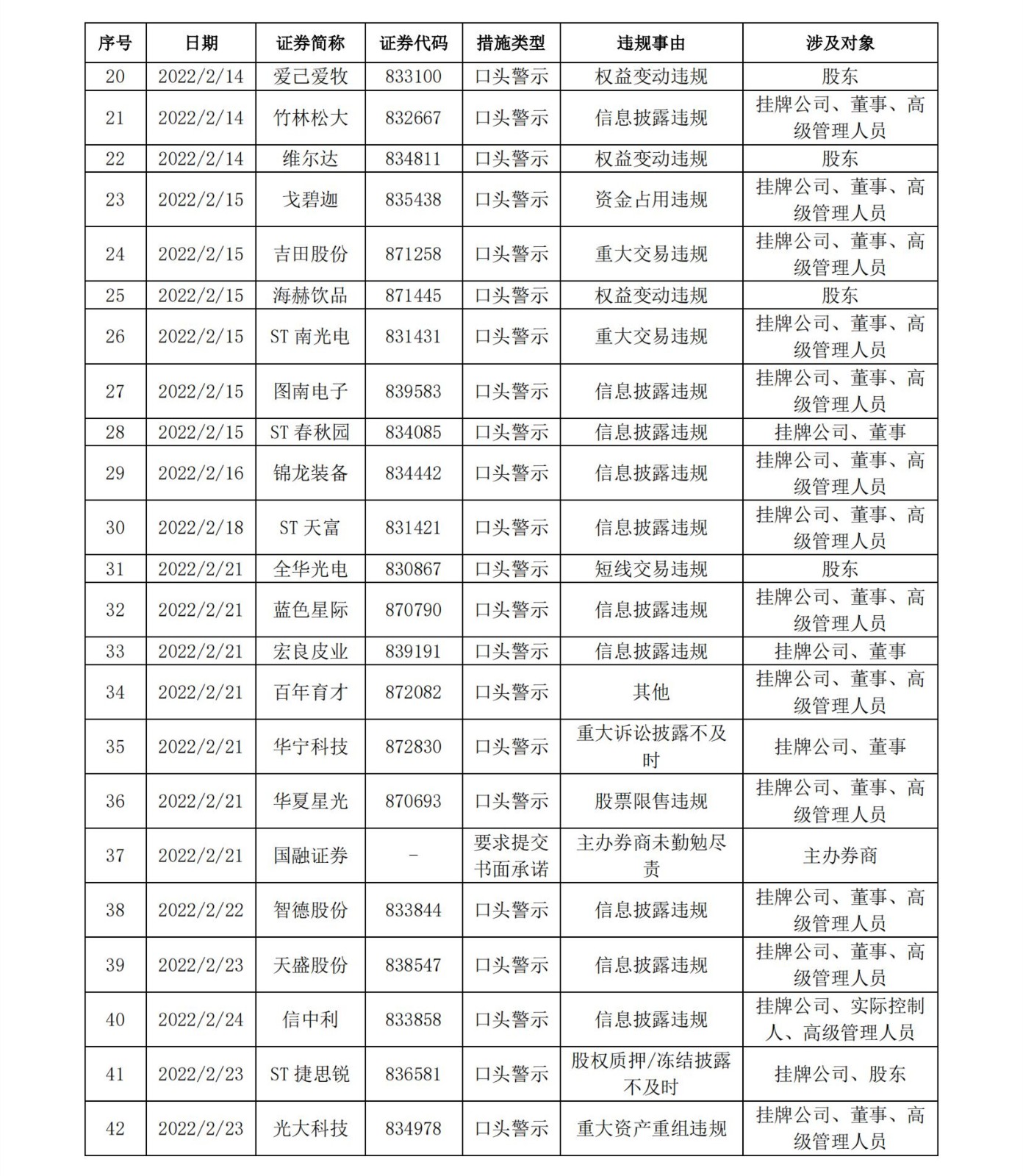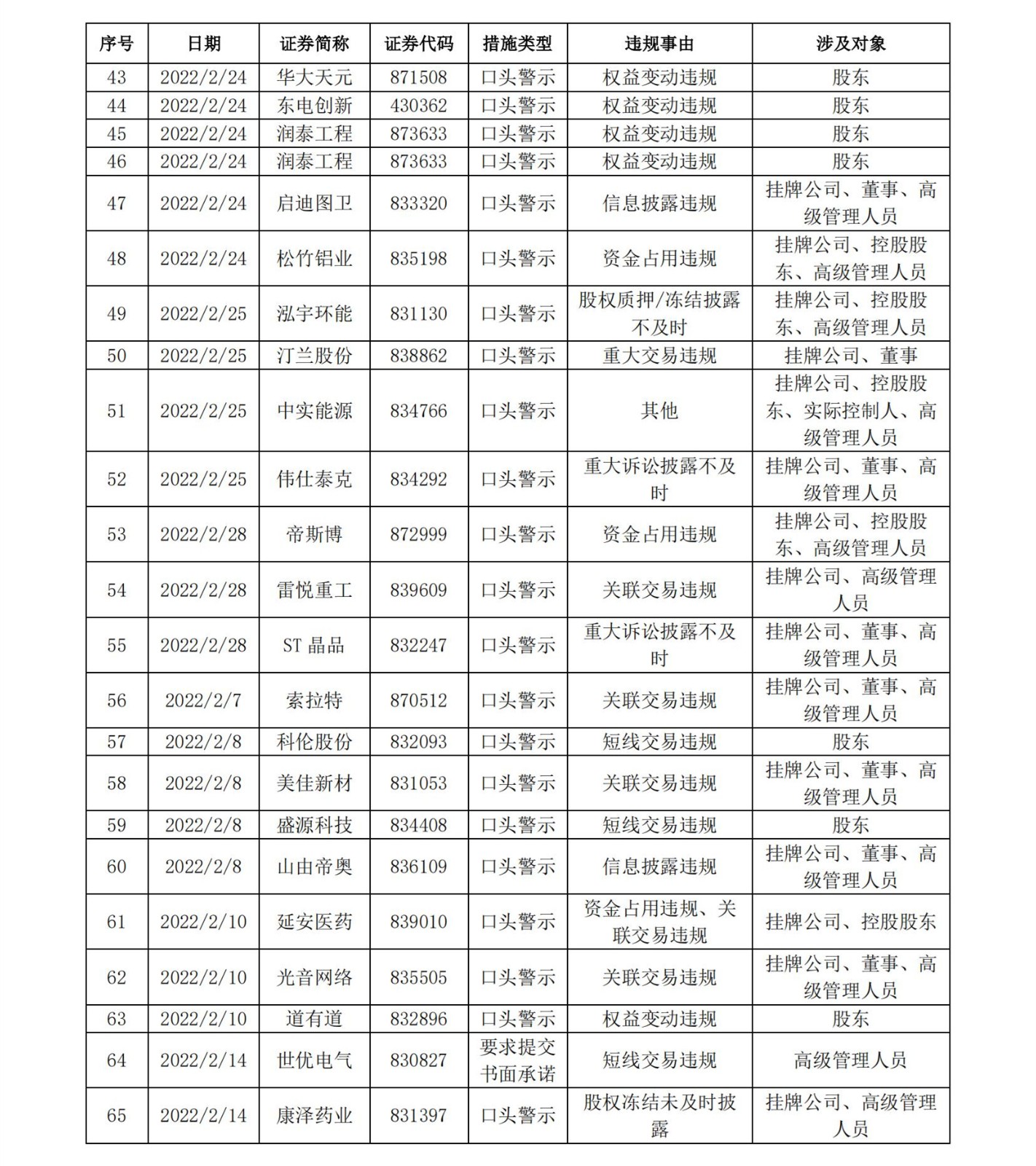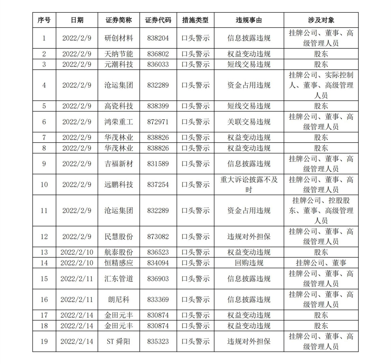 附-关于对挂牌公司及相关责任主体采取口头警示、监管关注、约见谈话、要求提交书面承诺监管措施的情况公示(2022年2月)