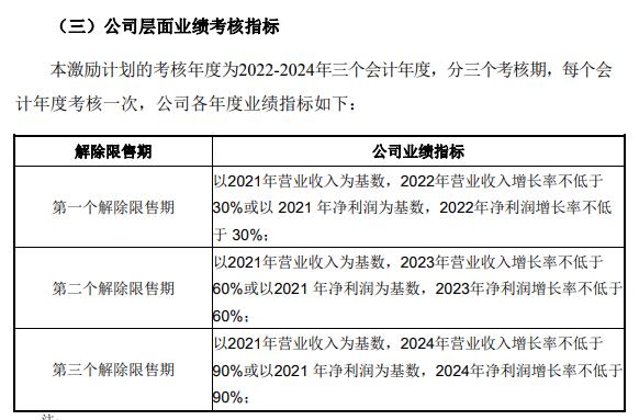 第一个解除限售期:以2021年营业收入为基数,2022年营业收入增长率不低于30%或以 2021 年净利润为基数,2022年净利润增长率不低于 30%;