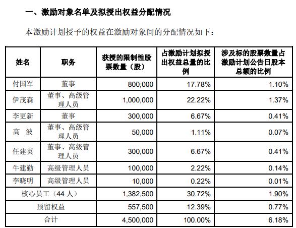 激励对象方面,首次授予的激励对象为董事、高级管理人员、核心员工,总人数为51人,占全部职工人数440人的11.59%。其中,董监高7人,分别为董事长付国军、董事总经理伊茂森、董事李更新、董事副总经理高波、董秘任建英、财务负责人牛建勤、副总经理李晓明。