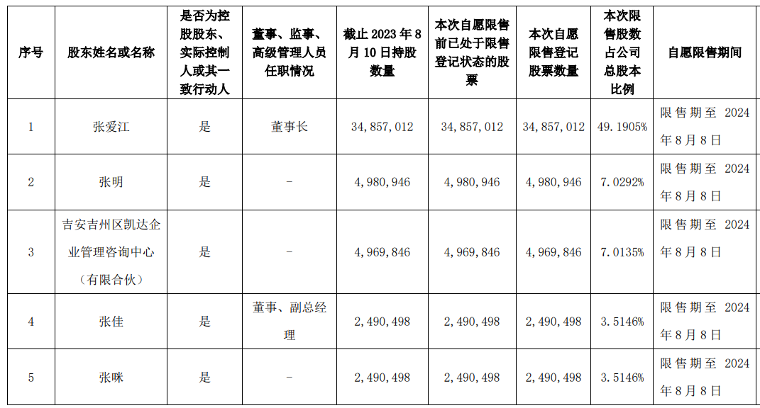 新赣江董事长等7名股东自愿限售:自愿限售数量共计5121万股 占公司总股本72%